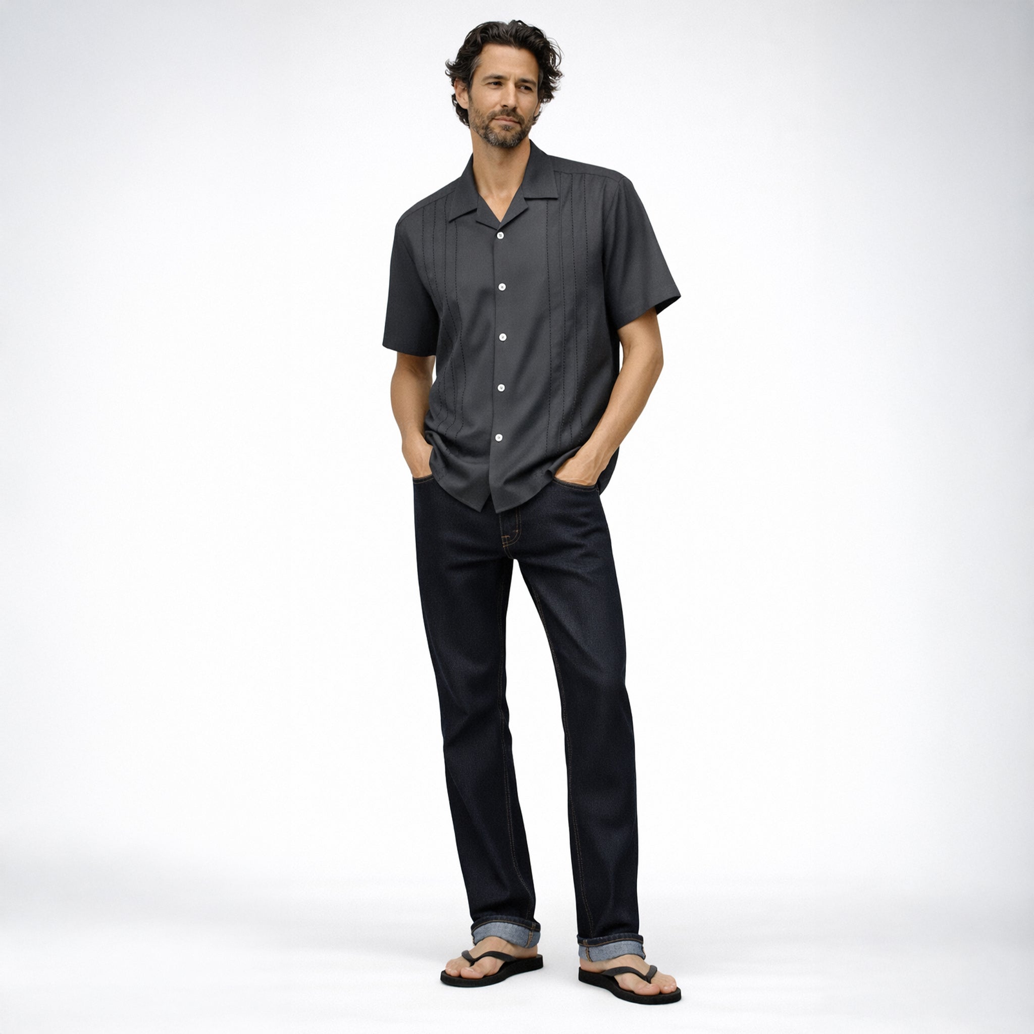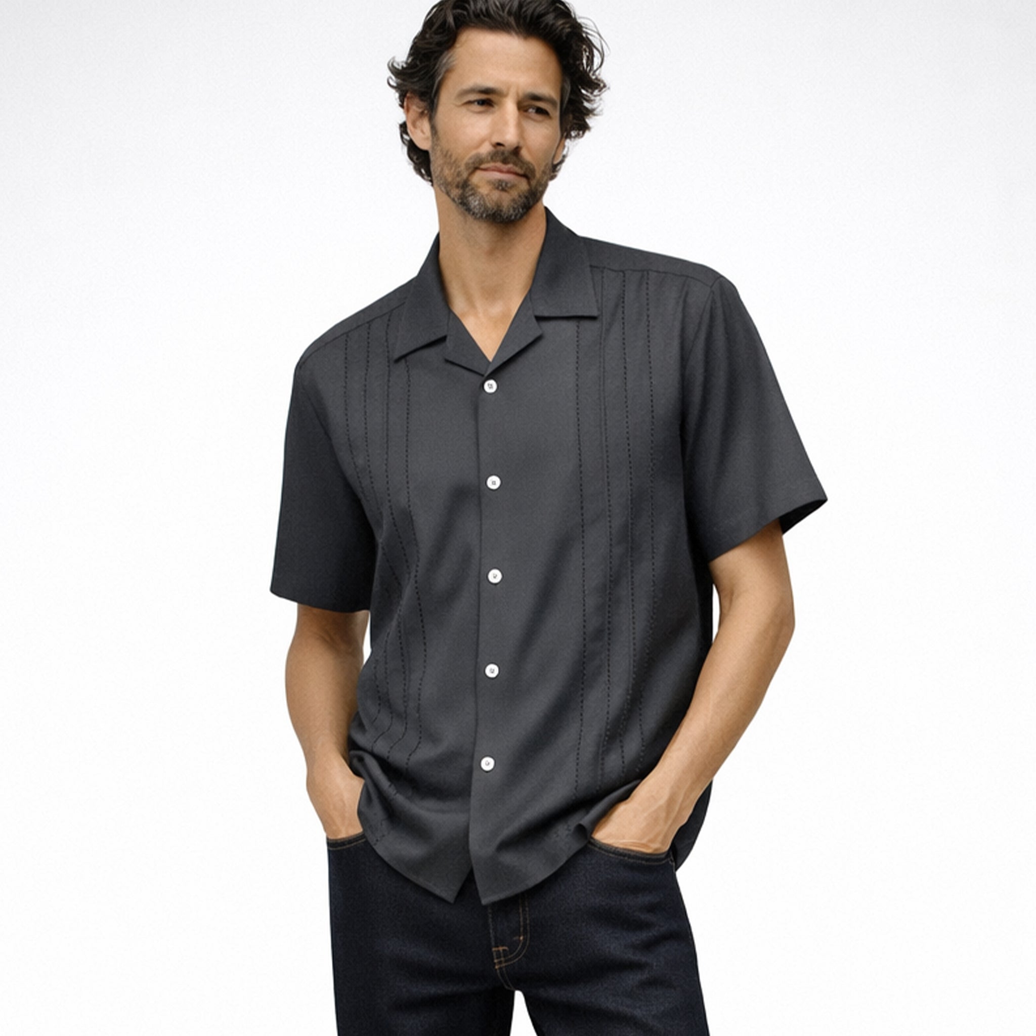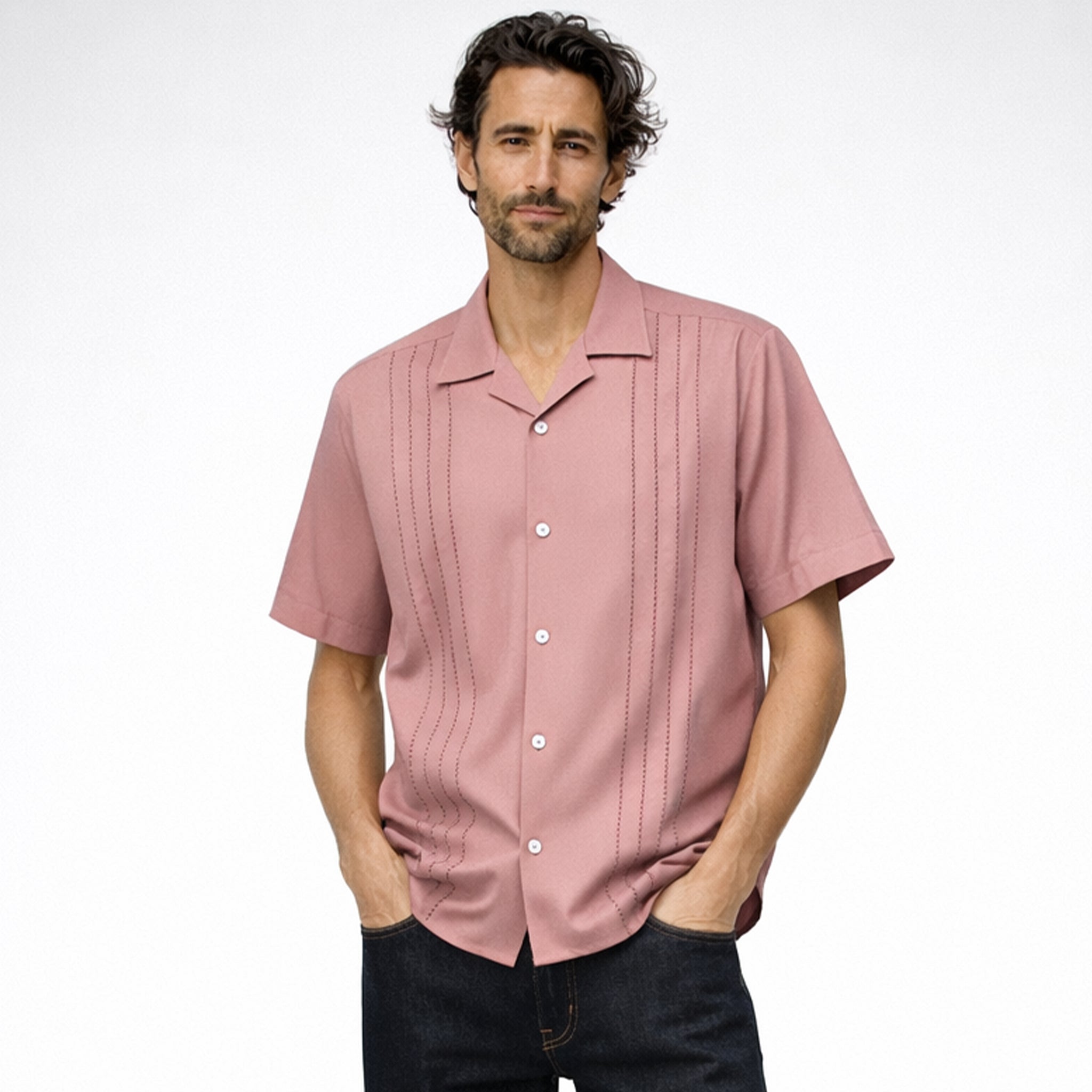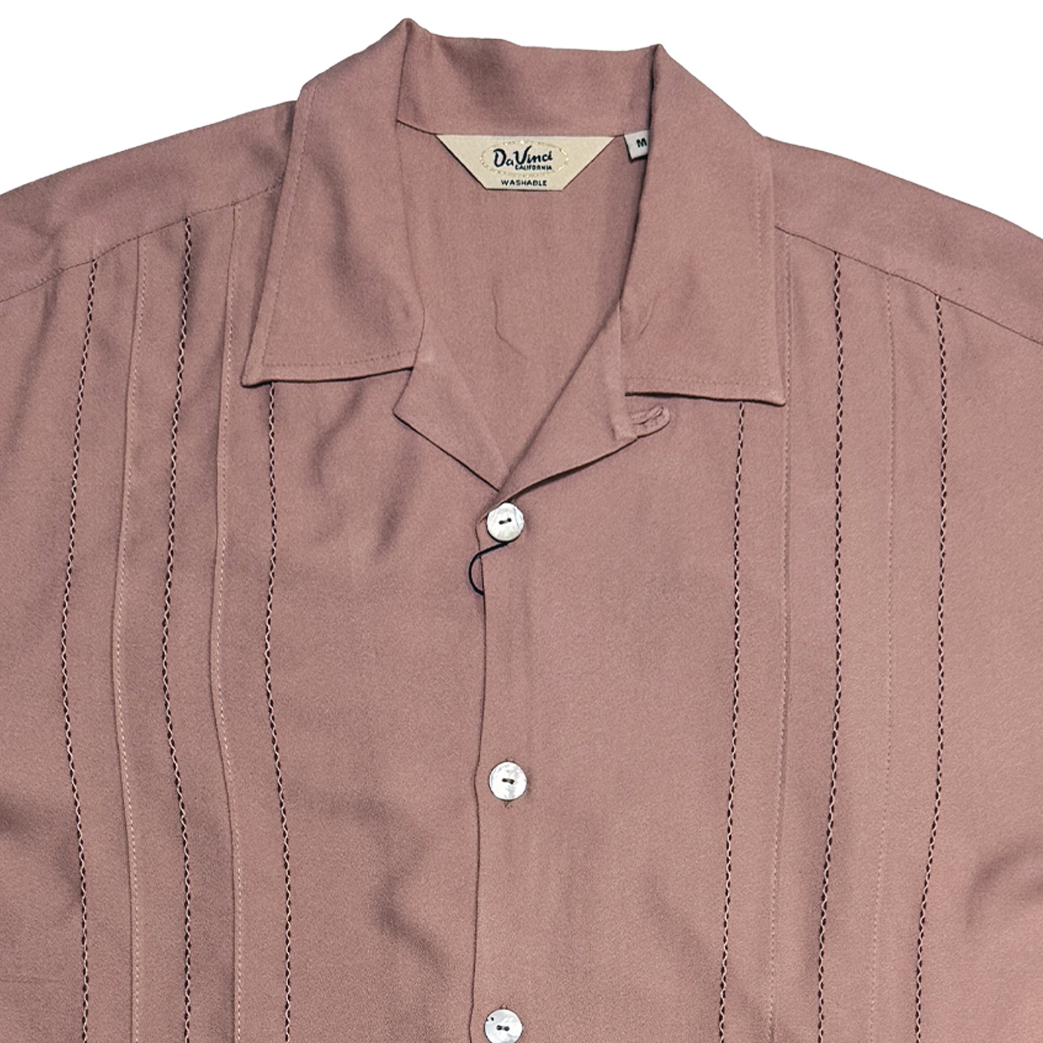 Retro-inspired front panel decorative stitch and relaxed California fit. Finished with fleur de lis embroidery on the back yoke, imitation akoya shell buttons, and a signature pyjama collar, the Decades shirt is a standout, Day or Night.