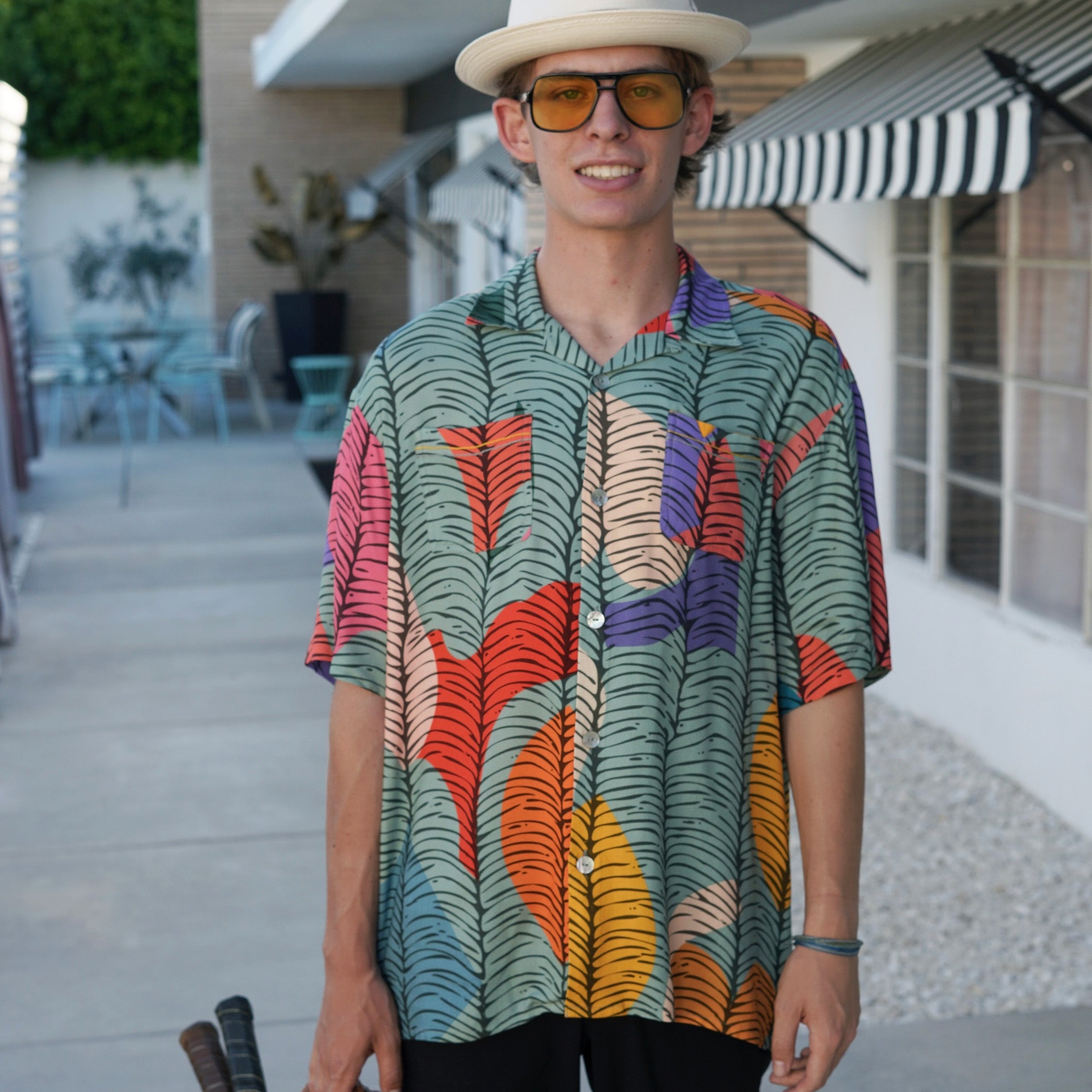 The Woody camp shirt brings artful design and laid-back California cool together in one standout piece. Featuring an oversized multi-color pattern inspired by vintage mid-century style, it’s crafted in lightweight 100% viscose moss crepe (132gsm) for a fluid drape and breathable comfort that moves with you.